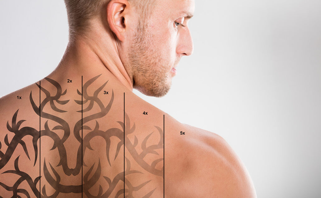 Laser Tattoo Removal On Shirtless Man’s Back Against Grey Background